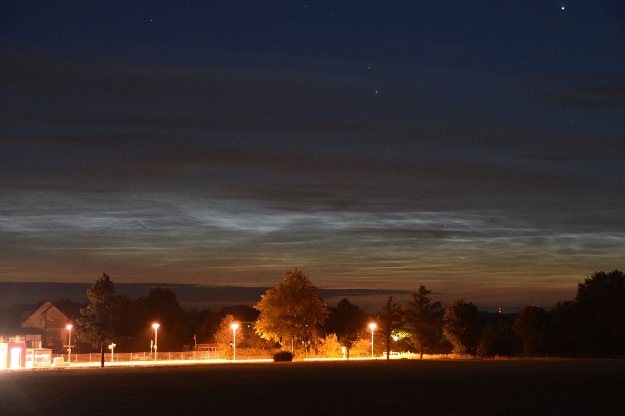 Gegen 23:35 Uhr waren die ersten NLC Richtung Norden auszumachen. Sie wurden immer heller (oder hoben sich immer stärker von der Dämmerung ab), sodass sie gegen Mitternacht eine Helligkeit von 2 erreichten. Die Ausdehnung betrug etwa 45° bei einer Höhe bis 7°.
