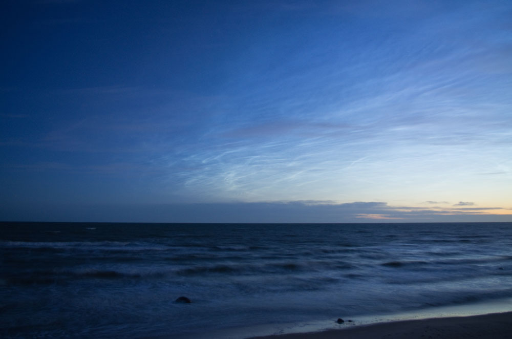 In dieser Nacht habe ich in Lettland auch schöne NLC gesehen, am Strand zwischen Sārnate und Užava (57°09' N, 21°25' E). Zum Sonnenuntergang gab es schon einen schönen Grünen Strahl über der Ostsee.