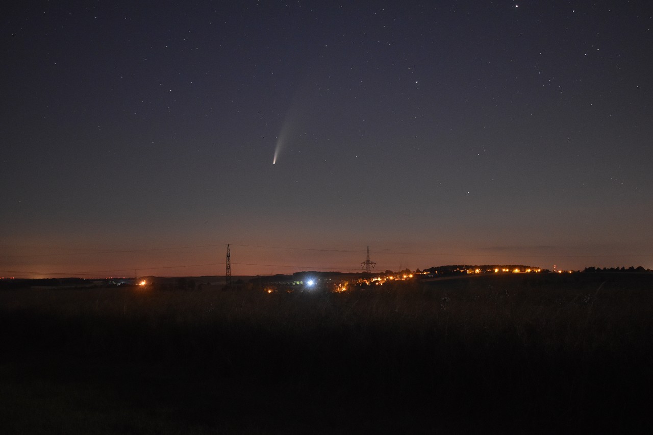 Vorgestern Nacht (10.07) habe ich ihn aus dem Fenster mit leichten NLC gesehen: Über der Flensburger Förde: Über Flensburg: Habe leider derzeit kein gutes Teleobjektiv, daher nur Landschaftsbilder vom Kometen