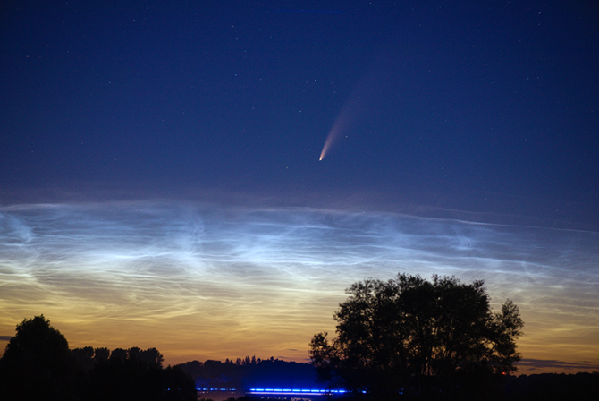 Visuell verschwindet er nun doch deutlich schneller vom Nachthimmel, als ich das noch vor ein paar Tagen für möglich gehalten habe, als es noch so schien, als wollte C/2020 F3 so gar nicht an Helligkeit verlieren. Am Morgen war der Komet über dem hiesigen NLC-Display kaum visuell auszumachen, wahrscheinlich hat der Kontrast in Sachen Helligkeit (NLC bei sehr guter H4) hier wiederum maßgeblich mitgewirkt.