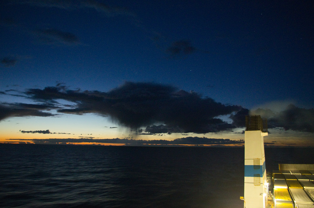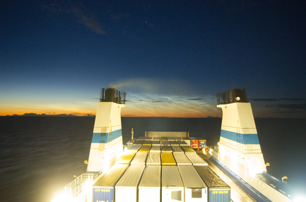 In dieser Nacht fuhr ich mit der Fähre von Helsinki nach Travemünde. Dort gab es auch die für mich bisher schönste Beobachtung eines grün-blauen Strahls zu Sonnenuntergang. Später zeigten sich Schauerwolken mit Fallstreifen im Nordwesten, und dazwischen schauten ein paar NLC hervor: