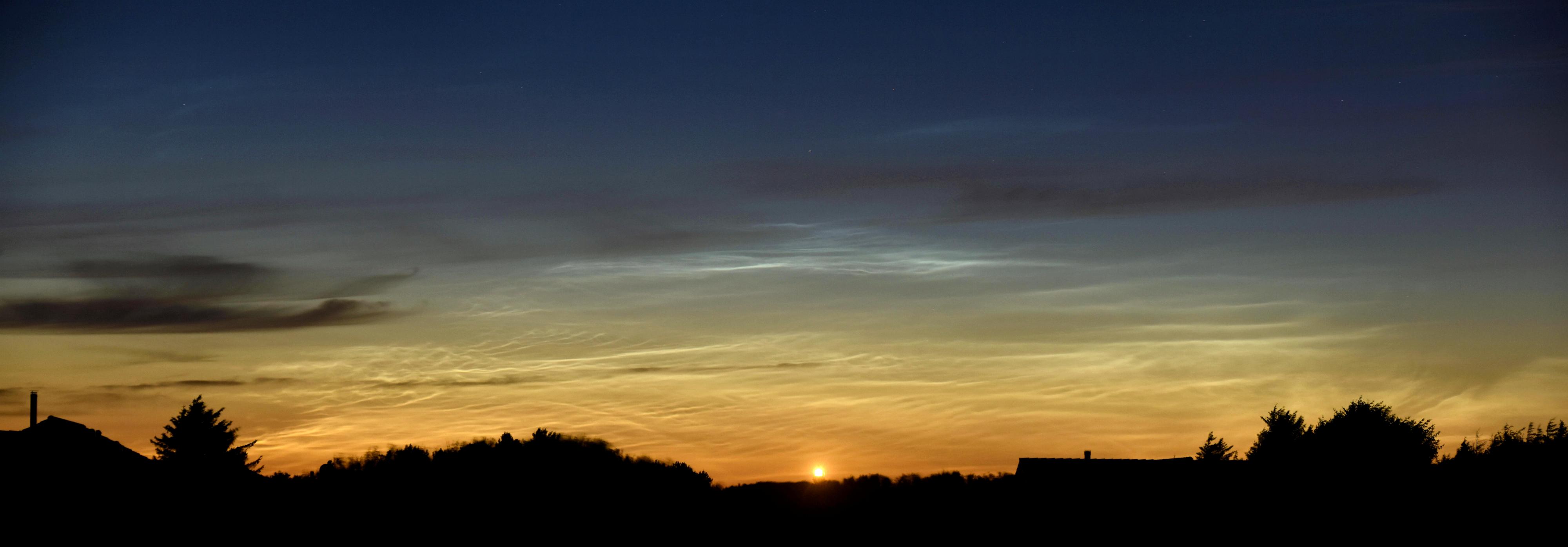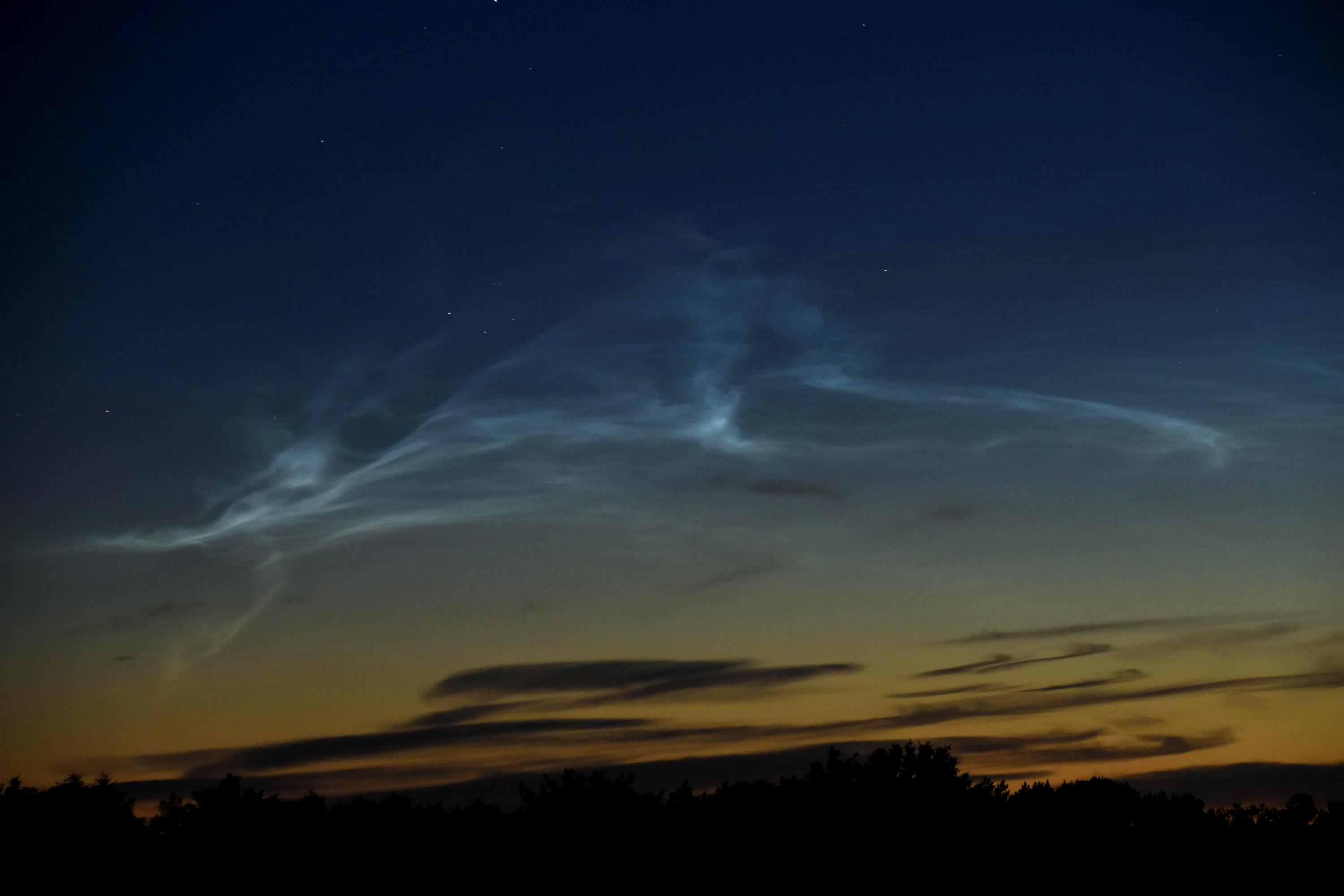 Erste schwache NLCs wurden knapp über den Baumwipfeln in Azimut ca.20° gg. 2:38Uhr bei Sonnenstand -15,8° im Fernglas erkennbar. Der folgende Dämmerungsverlauf war interessant, zeigte eine deutliche horizontale "Kante", einen ungewöhlich steilen Helligkeitsgradienten über dem NO-Horizont. Oberhalb der "Kante" abgesetzt wesentlich dunklerer Himmel. Ob es sich hierbei um ein im Azimut sehr breites, jedoch (visuell) strukturloses NLC-Feld gehandelt hat, ist mir immernoch unklar. Vielleicht bringen meine eigenen Fotos und/oder Studium der Bilder Anderer da Klarheit. Eventuell spielten Aerosole der Waldbrände über Sibirien eine Rolle?