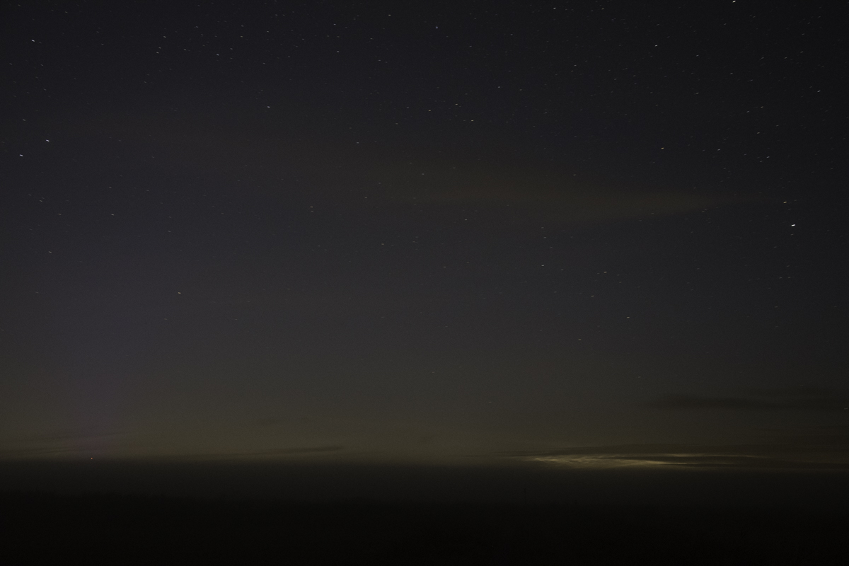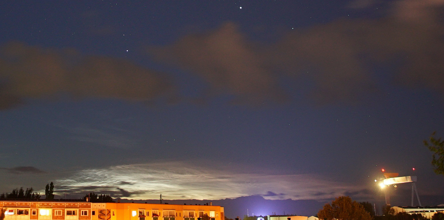 Eine erste Durchsicht des Fotomaterials bestärkt mich in der Annahme, dass im Nordosten, abgesehen von den im Foto erkennbaren eingebetteten konkreten NLC-Fädchen (Typ IIb), breit weitgehend strukturlose NLCs (Typ I) präsent waren, welche den Dämmerungsverlauf prägten.