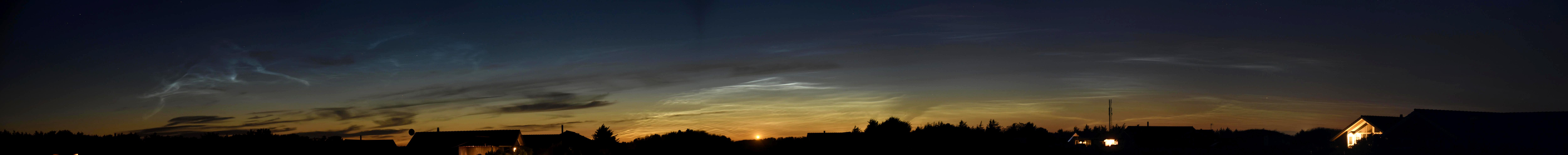 Erste schwache NLCs wurden knapp über den Baumwipfeln in Azimut ca.20° gg. 2:38Uhr bei Sonnenstand -15,8° im Fernglas erkennbar. Der folgende Dämmerungsverlauf war interessant, zeigte eine deutliche horizontale "Kante", einen ungewöhlich steilen Helligkeitsgradienten über dem NO-Horizont. Oberhalb der "Kante" abgesetzt wesentlich dunklerer Himmel. Ob es sich hierbei um ein im Azimut sehr breites, jedoch (visuell) strukturloses NLC-Feld gehandelt hat, ist mir immernoch unklar. Vielleicht bringen meine eigenen Fotos und/oder Studium der Bilder Anderer da Klarheit. Eventuell spielten Aerosole der Waldbrände über Sibirien eine Rolle?