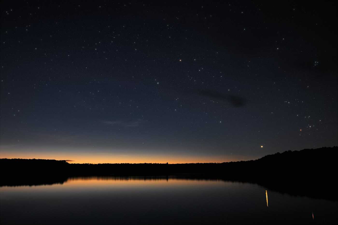 Der leichte Wind zauberte feine Wellen auf den See, wodurch Jupiter, Saturn, Arktur, sowie weitere helle Sterne sehr lange Lichtbahnen auf dem Wasser erzeugten.