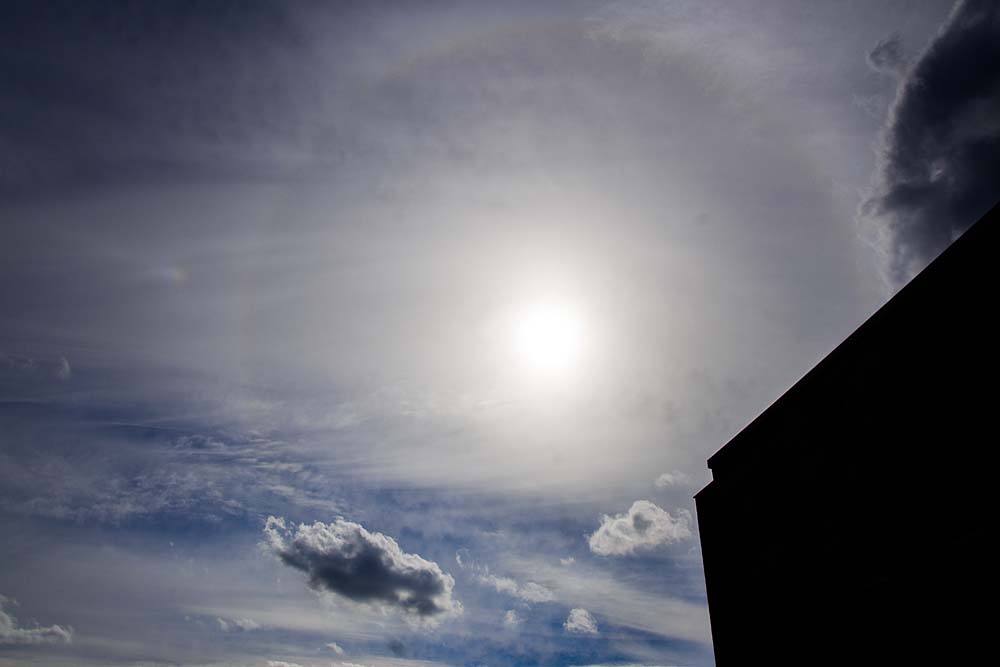 vorhin gab es hier in Berlin ein 22°-Halo und auf dem Foto ist nach Kontrastverstärkung auch noch eine Nebensonne zu sehen (Sonnenhöhe 36,5°): Vorher gab es längere Zeit einen Kranz um die Sonne: Ansonsten war der Himmel auch schön liniert, allerdings nicht vor der Sonne, wie bei Uwe: Viele Grüße