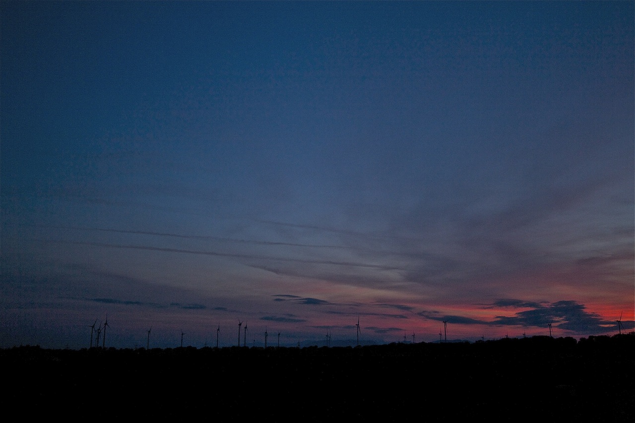 Der gestrige Abend leitete die Nacht mit einem auffälligen Purpurlicht ein. Wenngleich es unter diesem Ausläufer des Azorenhochs tagsüber trockene, leichte Winde aus Ost gab, werden die Nächte rasch empfindlich feucht, es herbstelt doch gewaltig.