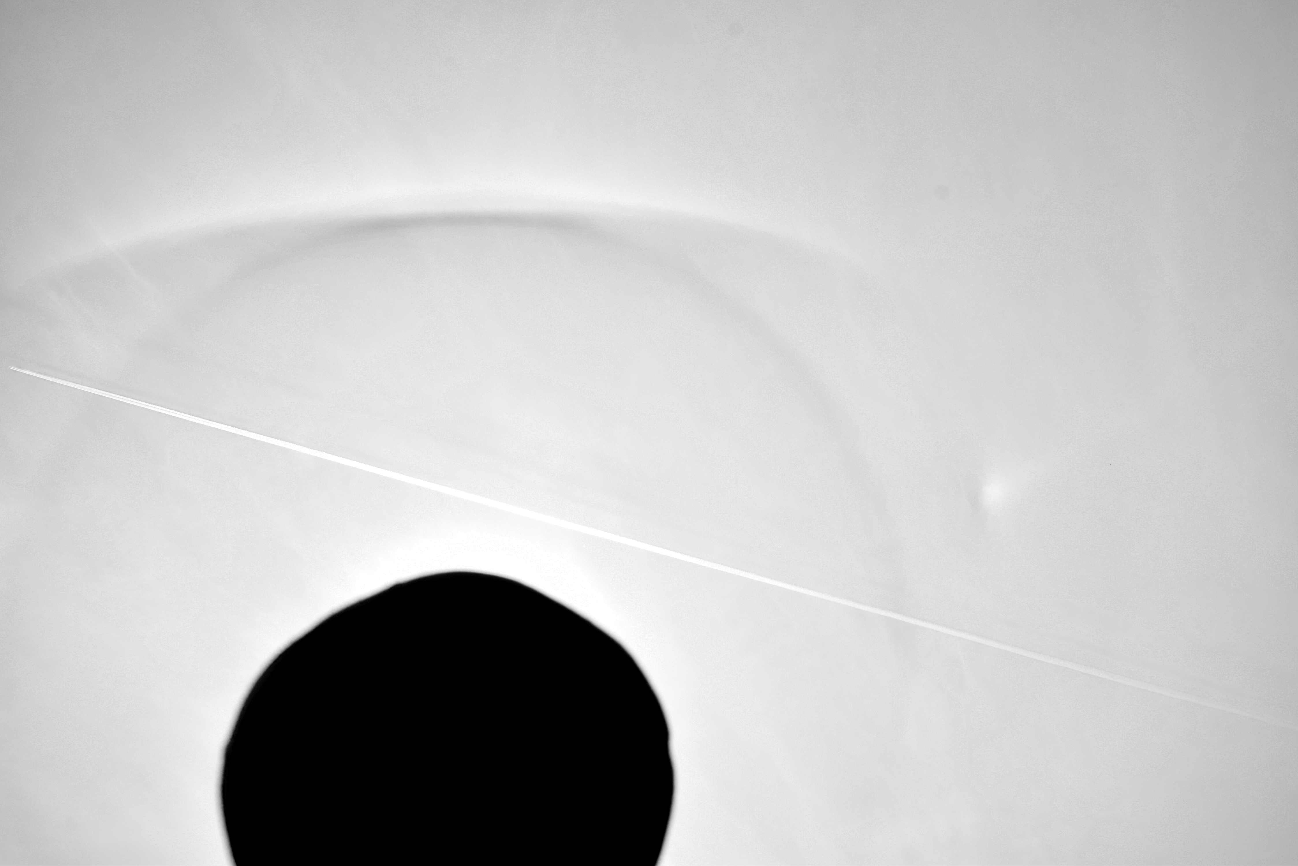 Sternförmige Schattenstrahlen im Bereich des 22°-Rings. Vielleicht ausgelöst durch den Kondensstreifen?