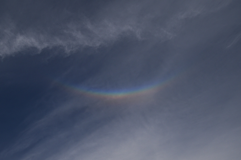 Einige Zeit später sah ich dann aber tatsächlich einen konkaven Parrybogen. Der Zirkumzenitalbogen war mittlerweile auch mit von der Partie, und es hingen Abschnitte des Supralateralbogens dran, die diesmal visuell mit Helligkeit 0 erkennbar waren. Damit reichte es für ein visuelles Halophänomen (EE01, 04, 05, 11, 21AB, 27A). Hier um 16:54: