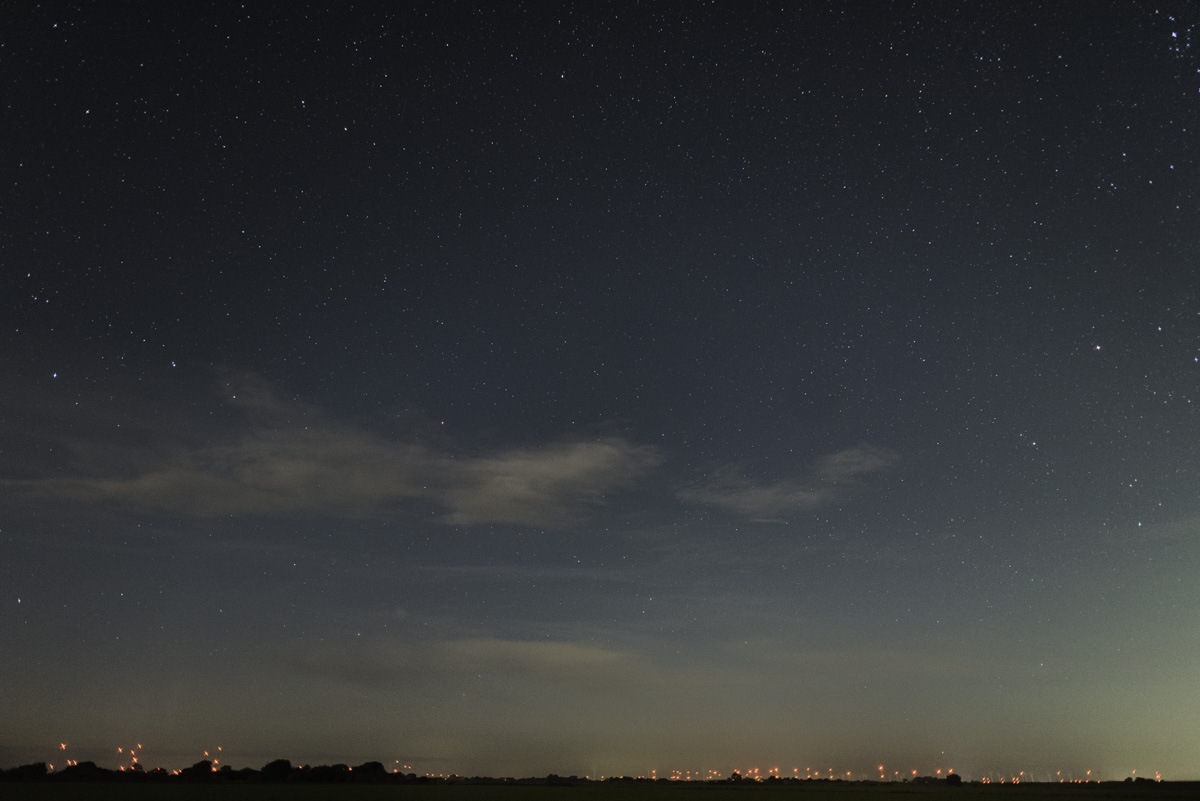 Ich habe meine Bilder von gestern Abend bereits wieder gelöscht. :( Zu dem peak gegen 22.45 UTC hatte ich die Kamera auf dem Dachfenster platziert. Je tiefer die MMs gingen, desto mehr zog aber Mister M. den Wolkenvorhang zu. Beim durchscrollen der Bilder stellte ich etwas fest, dass sich tief am Horizont langsam von Ost nach West bewegte. Die Wolken zogen streng von Süd nach Nord. Später in Lightroom war an besagter Stelle ein Baemer zu erahnen.