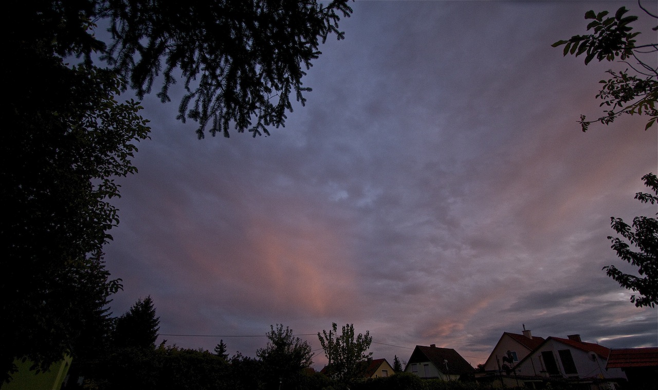 Ein letztes Irisieren kurz vor Sonnenuntergang und eine aufziehende Gewitterfront aus West über dem Wiener Becken beendeten den Tag. Nachts kämpfte sich die Kaltfront gegen die angestaute Warmluft durch und es gab ordentlich Gewitter und Schauer. Damit brach die Föhnlage endgültig zusammen.