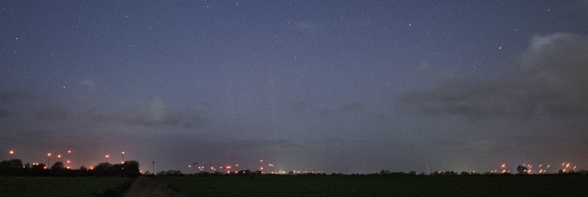 hier meine bescheidene Ausbeute. Ich war zwar rechtzeitig aus Hamburg raus an einen Standort mit dunklem Nordhorizont gefahren (Westerrade), jedoch zogen genau mit Beginn des Substorms Wolkenfelder durch (und der Halbmond störte doch schon sehr). Ich richtete das Bildfeld der Kamera deswegen etwas weiter nach Nordwesten, weil dort die Wolke als erstes verschwinden würde. Deswegen habe ich die Beamer auch nur am rechten Bildrand (Nord), beginnend mit der dort freien Sicht ab 20:30 MEZ und bis 20:47 MEZ, als es sich wieder zuzog. Dementsprechend brach ich die Beobachtung kurz danach ab.