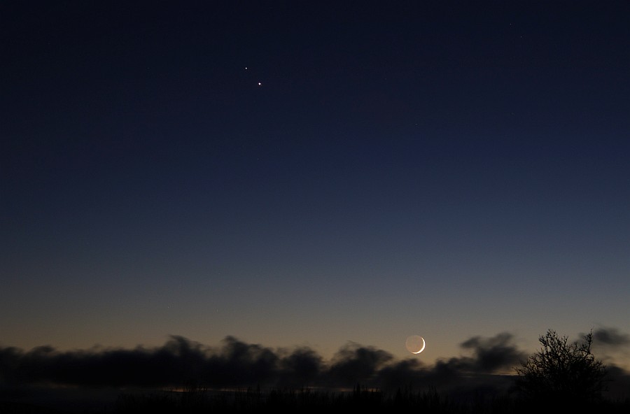 Und nicht vergessen: HEUTE steht die schmale MONDSICHEL links von Jupiter und Saturn!