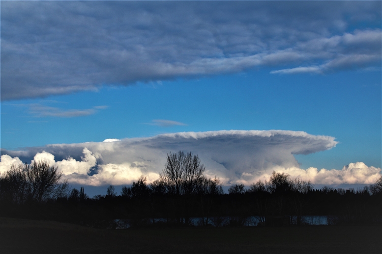 Gestern sah ich über dem Wiener Becken meinen ersten Cb, der mit viel Anlauf beeindruckende Aufstiegsschlote zeigte aber alsbald mit stark abflachenden Amboss wieder abflaute. Man sieht kleine overshooting tops, einen inflow und etliche Schlote. Es kam bei uns leider kein Schneeschauer zustande.