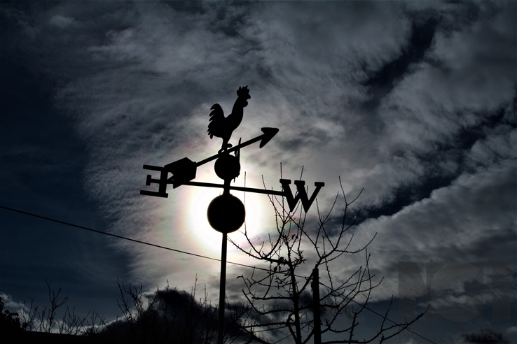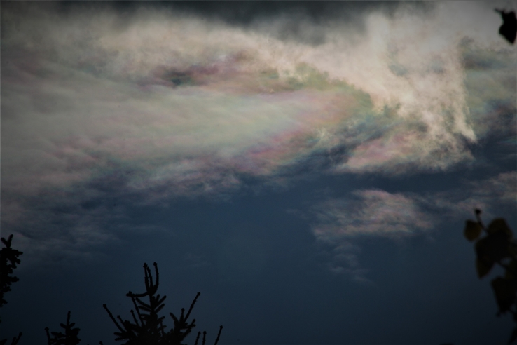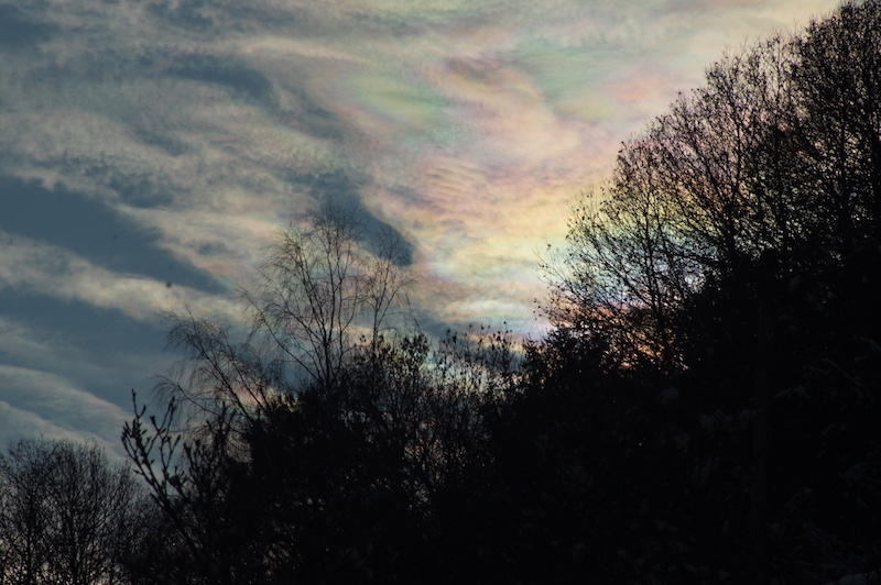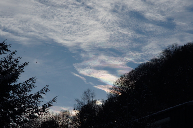 Gestern (11.01.2020) hatten wir wieder einen schönen Sonnenaufgang mit Vörwärtsstreuung am den Bäumen am fernen Hang. Nachmittags dann prächtiges Irisieren (auch mit bloßem Auge sehr farbig, was sehr selten ist!). Ich hielt die Wolken für (unterkühlte) Cirren, vermutlich waren sie im Bereich zwischen Ac und Cc. Bei Sonnenuntergang dann noch ein sehr intensives Abendrot wie schon mehrfach in den vergangen Wochen, aber da war ich unterwegs und konnte keine Bilder machen.