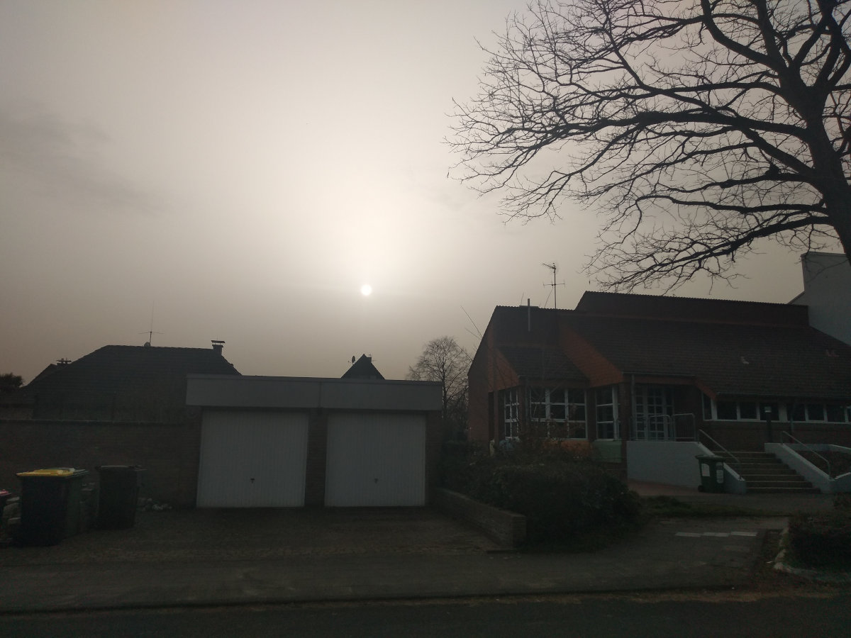 heute kam in den Nachrichten, dass sich Saharasand in der Atmosphäre befinden soll und dass deshalb die Sonnenauf- und -Untergänge farbiger ausfallen könnten. In Dormagen habe ich das Gegenteil beobachtet: Die Lichtstimmung war fahl, der Himmel grau, und die tiefstehende Sinne war schwach im Dunst und ganz farblos. Sowohl der Sonnenaufgang als auch der Sonnenuntergang waren heute eher farblos. Den ganzen Tag wurde es nicht richtig hell, obwohl der Himmel fast wolkenlos war. So was habe ich zuletzt gesehen, als der Vulkan auf Island ausgebrochen war.