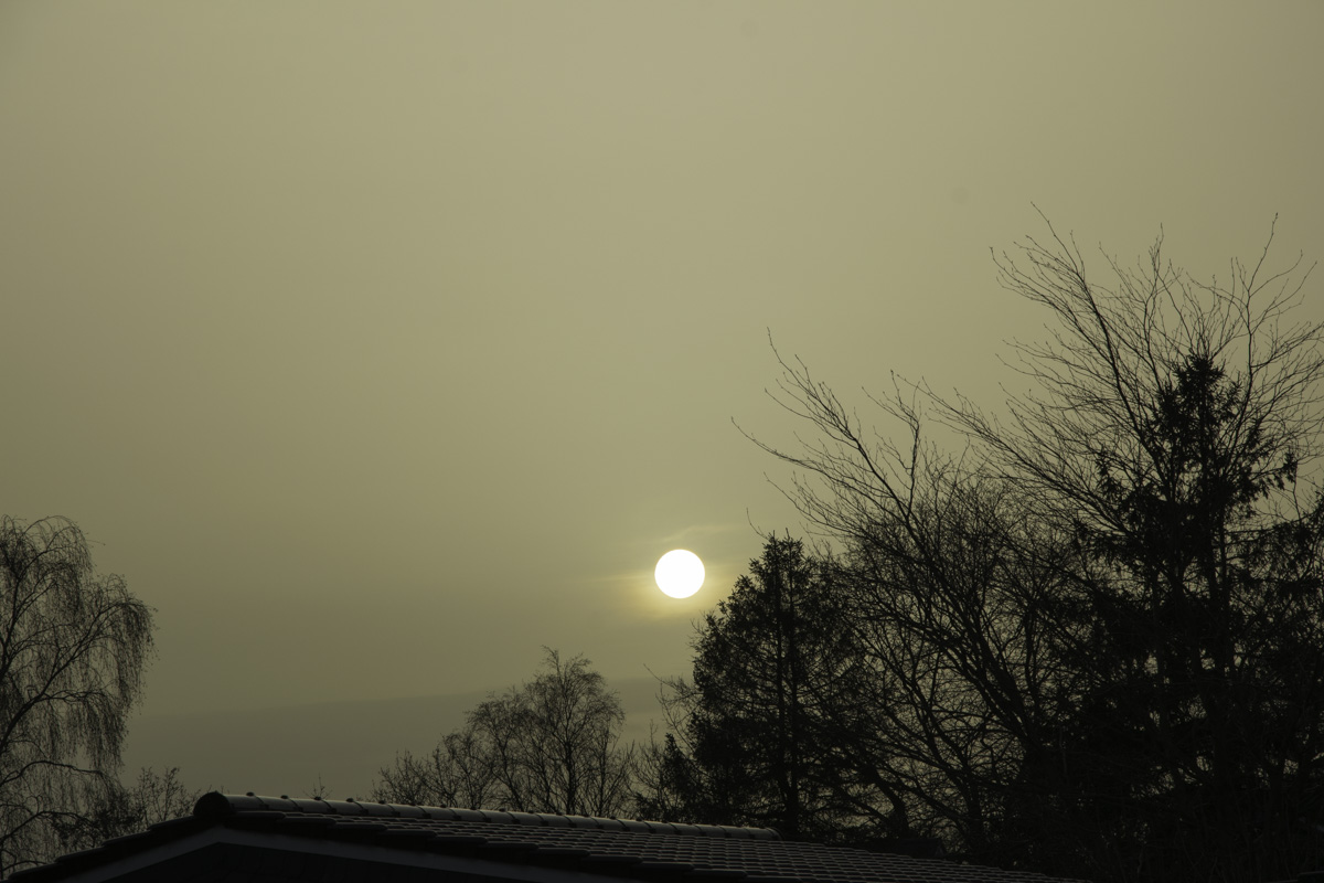 heute kam in den Nachrichten, dass sich Saharasand in der Atmosphäre befinden soll und dass deshalb die Sonnenauf- und -Untergänge farbiger ausfallen könnten. In Dormagen habe ich das Gegenteil beobachtet: Die Lichtstimmung war fahl, der Himmel grau, und die tiefstehende Sinne war schwach im Dunst und ganz farblos. Sowohl der Sonnenaufgang als auch der Sonnenuntergang waren heute eher farblos. Den ganzen Tag wurde es nicht richtig hell, obwohl der Himmel fast wolkenlos war. So was habe ich zuletzt gesehen, als der Vulkan auf Island ausgebrochen war.