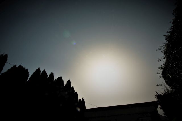 Die Beobachtung, dass alles farblos aussieht, ist im Prinzip richtig. Das schwache Braun löscht das Himmelsblau fast aus. Durch die Blendung sieht man dann fast keine Farben mehr. Tatsächlich kann man Saharastaub in der Luft schon bemerken ohne dass man zur Sonne guckt: Klare Sicht, aber die allgemeine Farbtemperatur ist höher, nicht so sonnengelblich wie sonst. Man muss stark unterbelichten, um die Farben zu sehen - und bei Betrachtung mit dem Auge eine extrem dunkle Sonnenbrille aufsetzen, dann sieht das so aus: