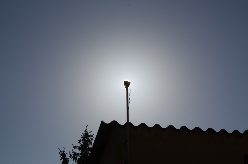 **hab's mal versucht und komme darauf, daß momentan tagsüber sage und schreibe über 45% der Allgemeinbeleuchtungsstärke (in lux) aus der Streuscheibe kommen. Das scheinbar paradoxe Ergebnis hat mit deren großen Raumwinkel gegenüber dem der Sonne zu tun. Von einem idealen Blauhimmel kommen hingegen nur 15% der Allgemeinbeleuchtungsstärke. (Absorption ist hier nicht berücksichtigt. Wer ein Luxmeter hat, soll mal morgen mittag und später an einem Blauhimmelstag messen, dabei das Gerät aber zur Sonne ausrichten. Auch Solardächler könnten hier Anhaltswerte liefern.)