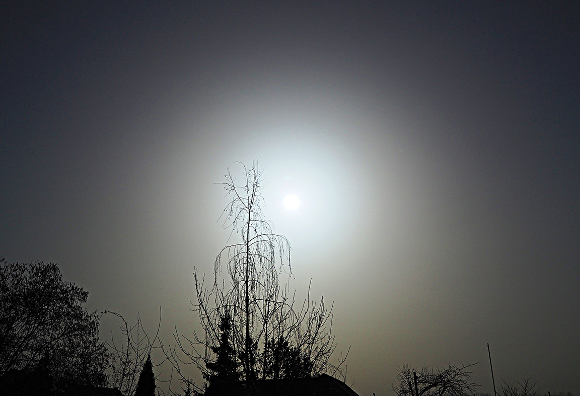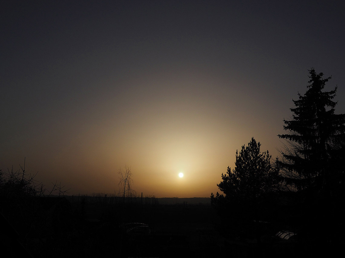 heute kam in den Nachrichten, dass sich Saharasand in der Atmosphäre befinden soll und dass deshalb die Sonnenauf- und -Untergänge farbiger ausfallen könnten. In Dormagen habe ich das Gegenteil beobachtet: Die Lichtstimmung war fahl, der Himmel grau, und die tiefstehende Sinne war schwach im Dunst und ganz farblos. Sowohl der Sonnenaufgang als auch der Sonnenuntergang waren heute eher farblos. Den ganzen Tag wurde es nicht richtig hell, obwohl der Himmel fast wolkenlos war. So was habe ich zuletzt gesehen, als der Vulkan auf Island ausgebrochen war.