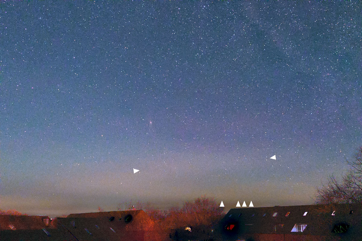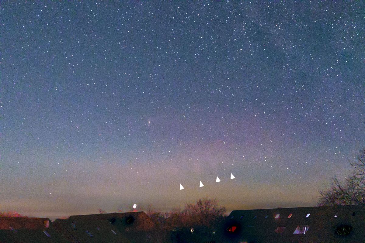 Am PC fiel mir dann bei der Bildbearbeitung die relativ gleichmäßigen Abstände der „Beamer“ auf, die ich auch noch spontan mit STEVE assozierte, und dann drittens waren dann bei den Raw-Bildern die „Beamer“ zartgrün gefärbt.