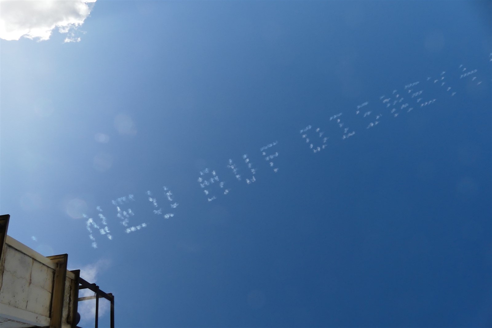 "Wir nutzen umweltfreundliches Paraffinöl, dass bei höherer Temperatur verdampft. Es bleiben keine Rückstände in der Luft - nur unsere Botschaften."