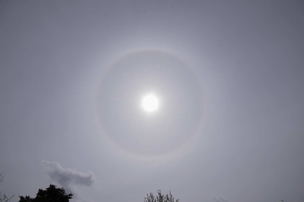 Zwischen 12:30 MESZ und 13:00 MESZ wegen der Sonnenhöhe umschriebener Halo (heller und deutlicher als der 22°-Ring)