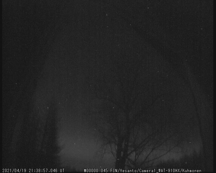 fyi, little bit of aurora activity right now, on central Finland. Watec meteor cameras could see band on low northern sky. Just came also outside, visually confirmed. The band (approx 15 degrees height) is weak and diffuse. No moving forms of aurora seen. Moonlight is reducing the visibility of auroras here...