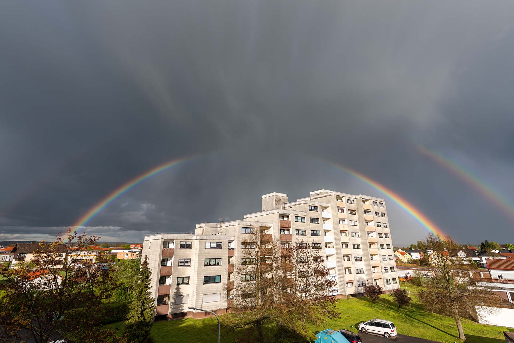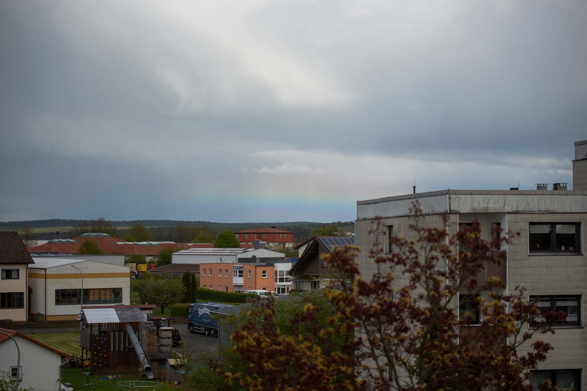 Heute habe ich nochmal einen sehr flachen Regenbogen von heute 16:40 Uhr. Vom Boden aus war er nicht sichtbar, nur aus dem dritten Stock konnte man ihn sehen. Leider konnte ich den rechten Teil nicht fotografieren, weil es keinen anderen Standort gab.