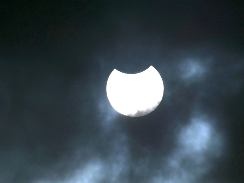 Konnte eben einen kurzen Blick auf die angeknabberte Sonne erhaschen. Eine winzige Wolkenlücke war vorhanden, nun ist wieder alles dicht. Immerhin gesehen
