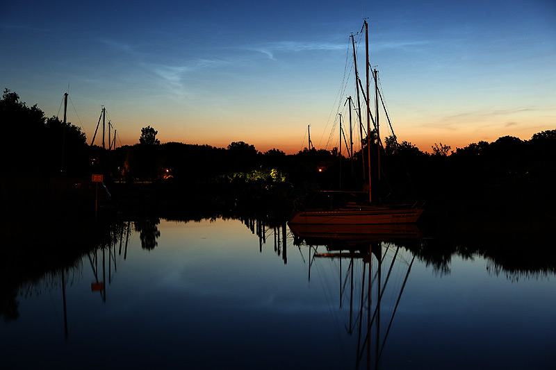 Schwache aber dennoch hübsche Leuchtende Nachtwolken vom Morgen des 9. Juni 2021, aufgenommen zwischen 02:00 und 03:00 Uhr in Greifswald entlang des Flüsschens Ryck.