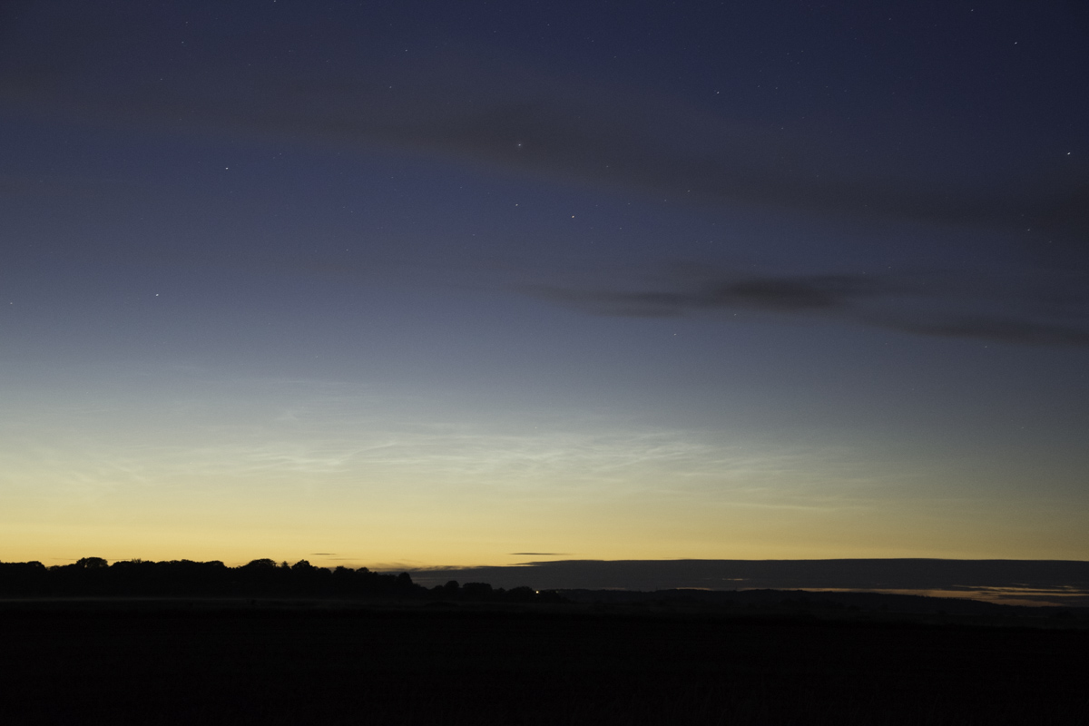 Auf der Flensburg-Webcam waren um 01:30 MESZ die ersten NLC schwach zu erkennen. Deshalb bin ich kurzentschlossen aus dem Ort heraus ins Moor gefahren. Nachdem meine Augen sich der Dunkelheit angepasst hatten, waren NLC im Bereich des Dämmerungsstreifens zwischen N und NO erkennbar.