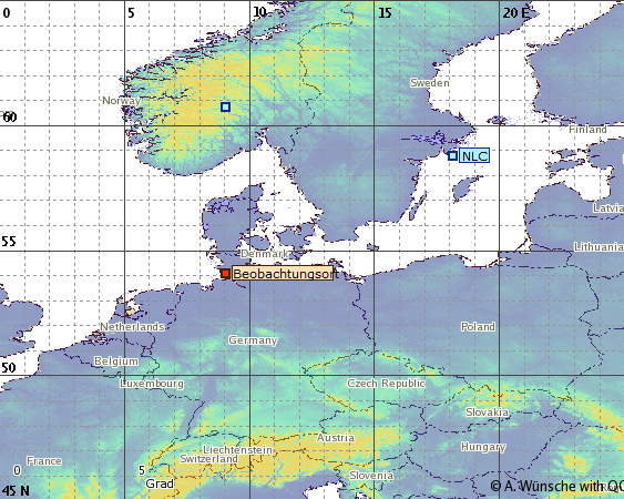 ps.: Wenn ich Olafs Angaben für die Höhe der heutigen NLC von 83,5 km verwende, verschiebt sich deren Lage in der Karte nur um etwa 5 km Richtung NNO (ca. 5 Pixel). Deswegen habe ich die Karte nicht nochmal neu erzeugt.