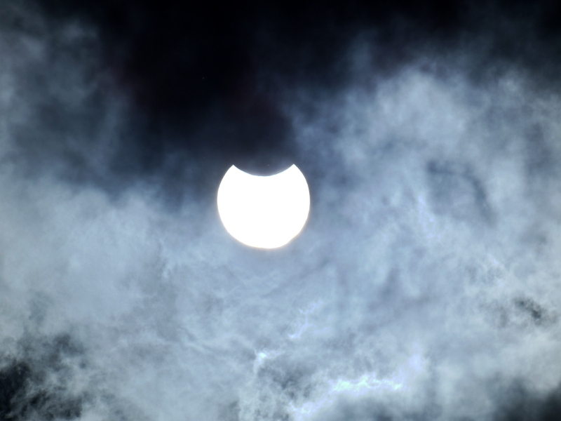 Konnte eben einen kurzen Blick auf die angeknabberte Sonne erhaschen. Eine winzige Wolkenlücke war vorhanden, nun ist wieder alles dicht. Immerhin gesehen