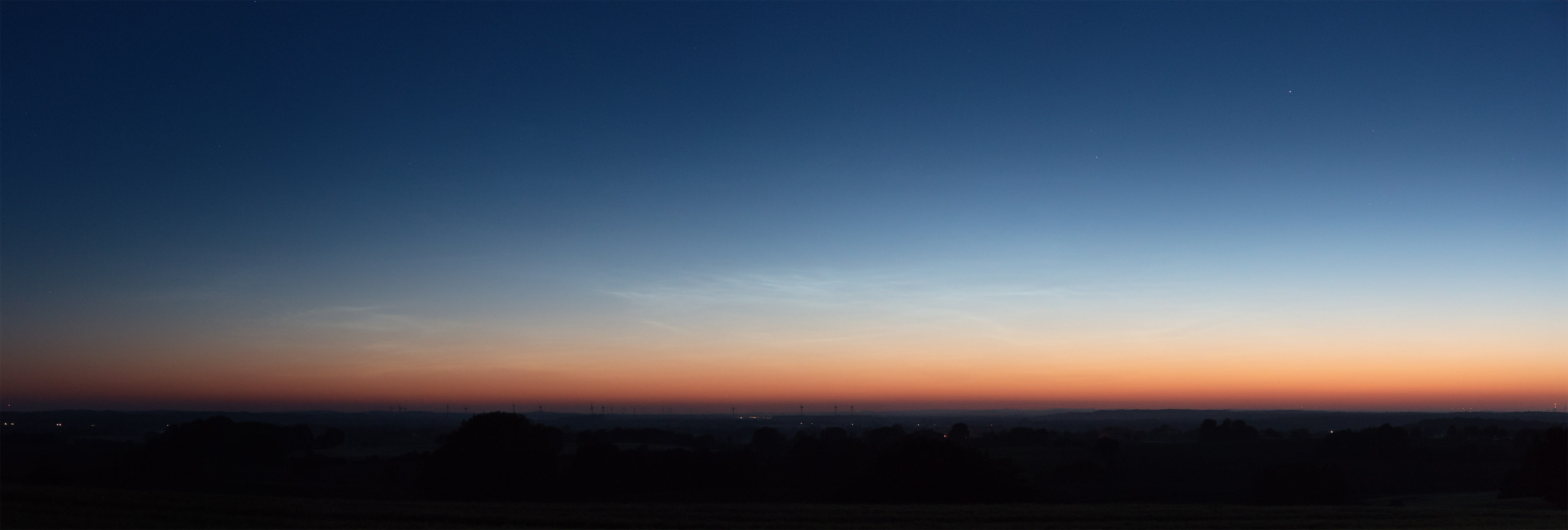 Als die Wälder endlich mal wieder einen Blick auf den Nordhimmel zuließen: Überraschung zwischen den Dörfern Rutenberg und Hasselförde (53.2714N, 13.3064E) gegen 2:30Uhr MESZ: Im Norden zeigte sich ein azimutal ausgedehntes aber lichtschwaches NLC-Feld! Helligkeit 1, vielleicht an der Grenze zu 2.