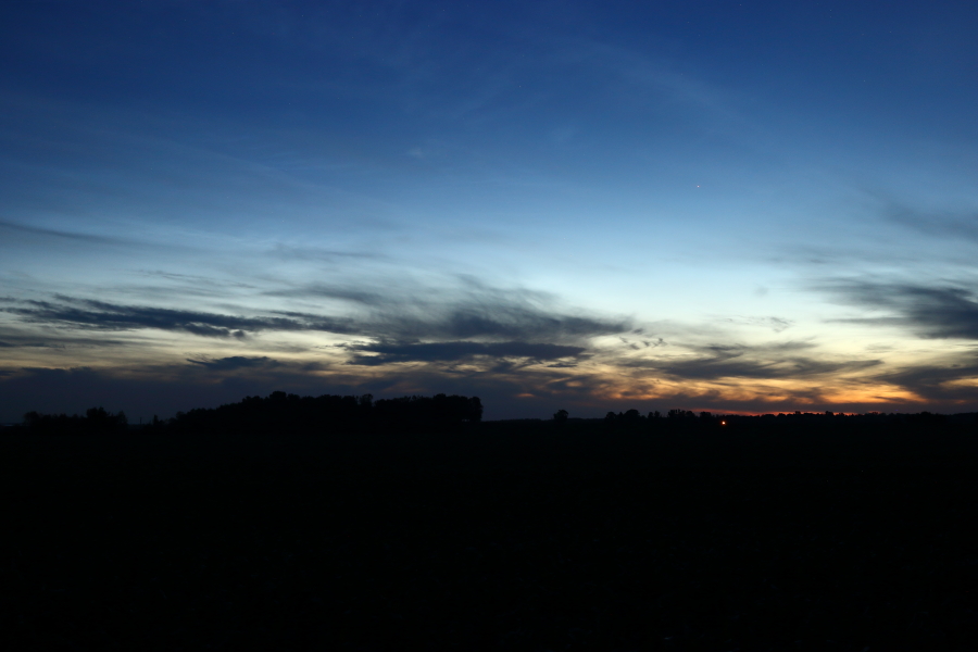 Am Ende einer ausgedehnten Tour durch Wald und Feld rund um Eilenburg zeigten sich hinter troposphärischem Gewölk doch nochmal einige NLCs, die gegen die fortgeschrittene Morgendämmerung allerdings arg in's Hintertreffen gerieten. Eigentlich hatte ich angesichts dichter Bewölkung am Horizont bereits zusammengepackt. Doch dann riss der Wolkenteppich unerwartet auf und es zeigten sich ungewöhnlich aufgehellte Bereiche in den Wolkenlücken, die sich in der Folge als NLCs herausstellten. Also auf den allerletzten Drücker nochmal Kamera und Stativ ausgepackt und festgehalten. Ich habe mich hier wieder für 3 Aufnahmen entschieden, die innerhalb von wenigen Minuten mit ein und demselben Bildausschnitt entstanden, um den Unterschied zwischen troposphärischem Gewölk und NLCs besser dokumentieren zu können.