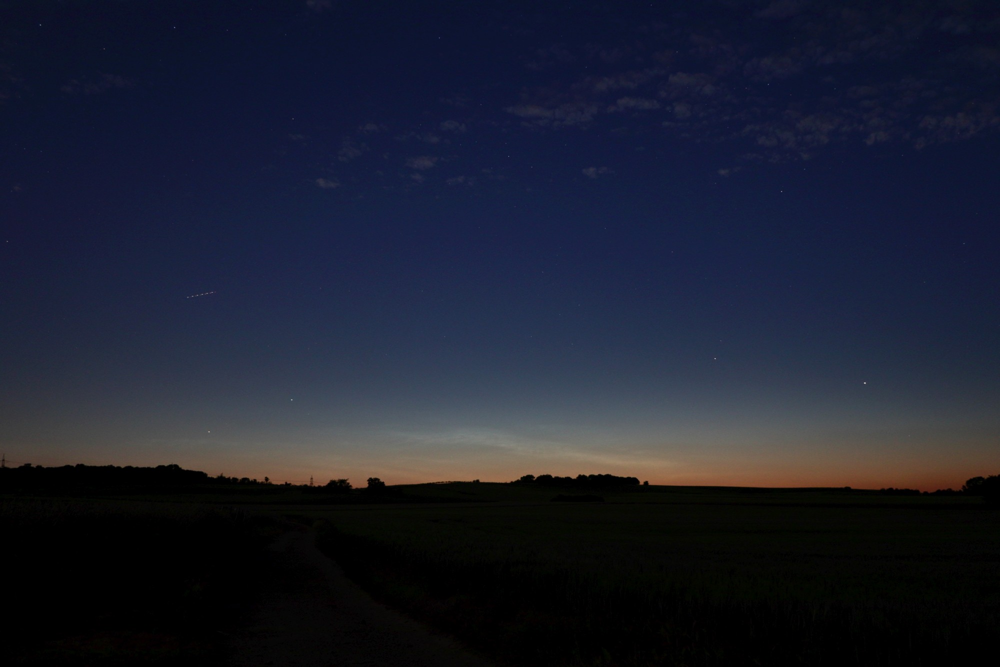 Hier mal noch mein Nachweis vom Abendsektor. Leider machte sich der Dunst über den Feldern und das troposphärische Gewölk bei der Bearbeitung des Materials im Vergleich zu dem, was ich auf dem Display der Kamera sah, dann doch deutlich stärker bemerkbar, als ich anfangs dachte. Bei der Bewertung der Helligkeit tue ich mich diesmal schwer. Denn einige Bereiche des Displays im westlichen Teil waren zeitweise so hell, dass ich geneigt wäre, hier auch eine 4 zu vergeben. Aber ob das nur meiner Hochsensibilität geschuldet ist, oder die NLCs tatsächlich die Aufmerksamkeit eines "Zufallsbeobachters" auf sich gezogen hätten, da bin ich mir letzten Endes nicht so sicher. Daher belasse ich es mal bei der 3.