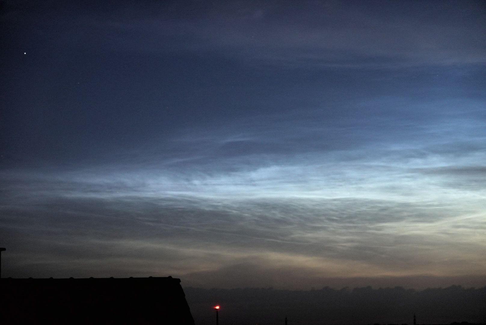Für das bloße Auge war das Bochumer Morgen-Display sehr blass, denn das NLC-Feld hing immer noch im selben Azimut wie am Abend und wurde entsprechend schlecht von der über 20° weiter rechts wieder höher steigenden Sonne erreicht. Aber erstaunlicherweise zeigte die Teleoptik eines chinesischen Billig-Handys die NLC wesentlich klarer und detailreicher als selbst das dunkelangepasste Auge, wenn auch stark verrauscht - hier drei Beispiele. Bemerkenswerte Erkenntnis: Das kann man tatsächlich als 'Detektor' für schwache NLC einsetzen, die visuell nicht ohne weiteres überzeugen ...