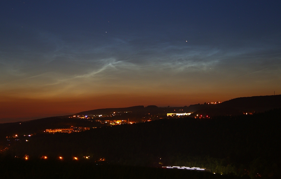 Auch am Nordrand von Wien am Rendezvousberg konnte ich die NLC mit freiem Auge sehen. Ab 20:30 UT waren sie wahrnehmbar (Sonne 11,3° tief), rund um 20:50 UT am hellsten (Sonne -13,0°), gegen 21:10 UT (-14,6°) verschwanden sie für das freie Auge.