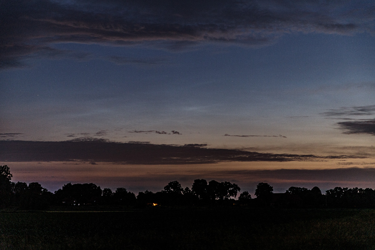 Wardenburg hing (und hängt) leider weiter unter Wolken. Da es aber nach 23 Uhr noch mal so aussah, als klare der Himmel auf, bin ich dann doch noch mal los. Der Blick Richtung Norden war nicht so wirklich toll, viel Gewölk. Trotzdem konnte ich noch leichte Strukturen von NLC einfangen. Ab 23:50 Uhr MESZ kann man erste Anzeichen erkennen. Eine knappe halbe Stunde später war es dann wieder zugezogen.