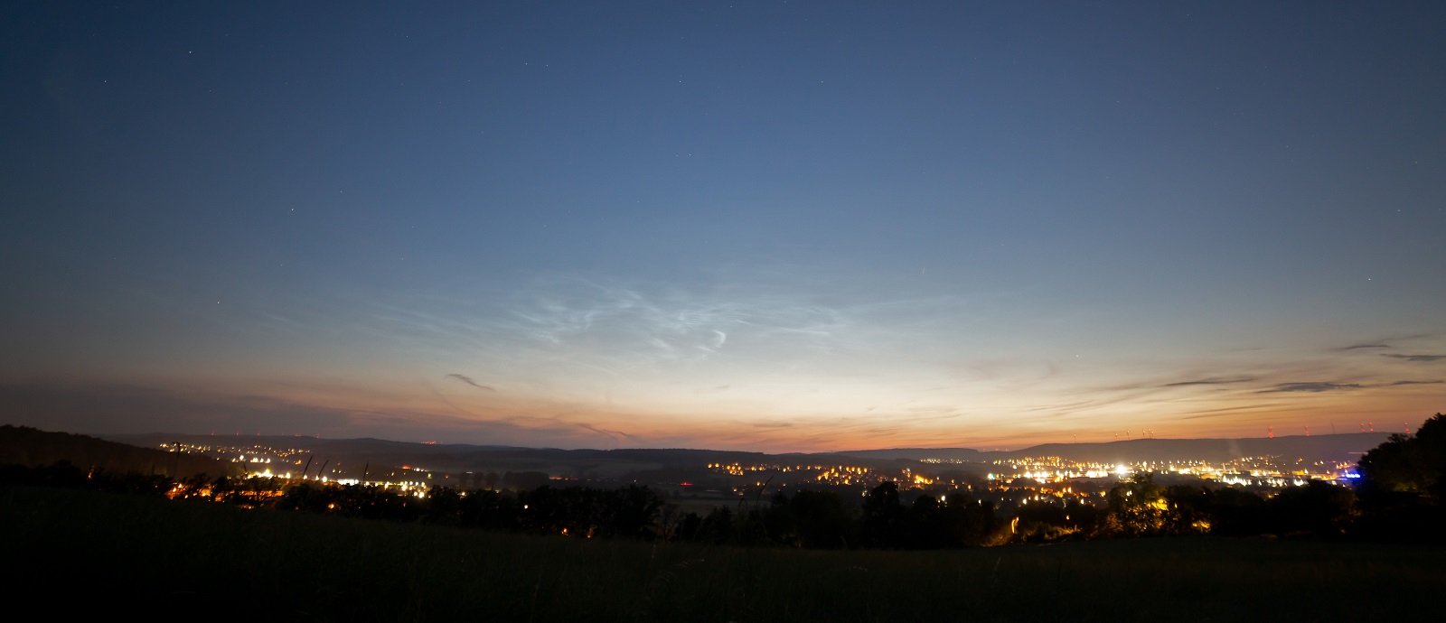Wenig später, mit der zunehmenden Dunkelheit, wurde das gesamte Ausmaß der NLC sichtbar. Neben dem kleineren Feld im Südwesten und Westen gab es ein großes, das sich von Nordwest bis Nordost erstreckte und dessen schwächste Ausläufer um 23:12 MESZ bis 43° Höhe reichten: