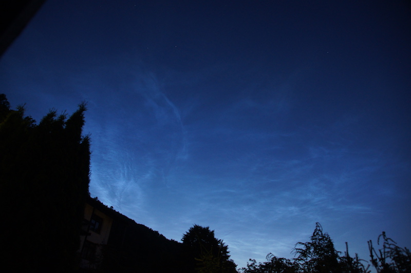 Als ich gegen 22:15 (MESZ) vom Sport zurückkam, fiel mir ein Wolkenfeld im Norden auf, das eigentlich zu hell für Cirren war, aber nach Cirren aussah und nicht nach NLC. Zumal weiter südlich noch eine Kondensstreifen-Cirre zu sehen war. Etwas später wurde klar, dass es tatsächlich NLCs sind. Es ist das erste Mal in diesem Jahr, dass ich sie hier von Heidelberg aus sehen konnte (meine dritte Erscheinung insgesamt).