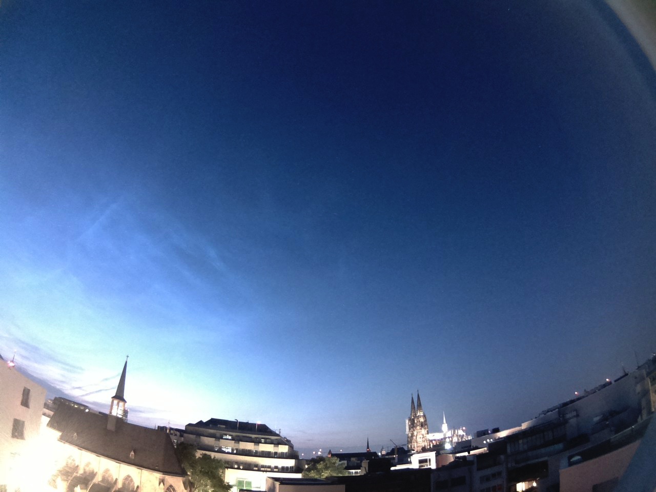 Antoniterkirche unten links im Bild noch von hellen Scheinwerfern angestrahlt wurde, die gehen erst zu Mitternacht aus.