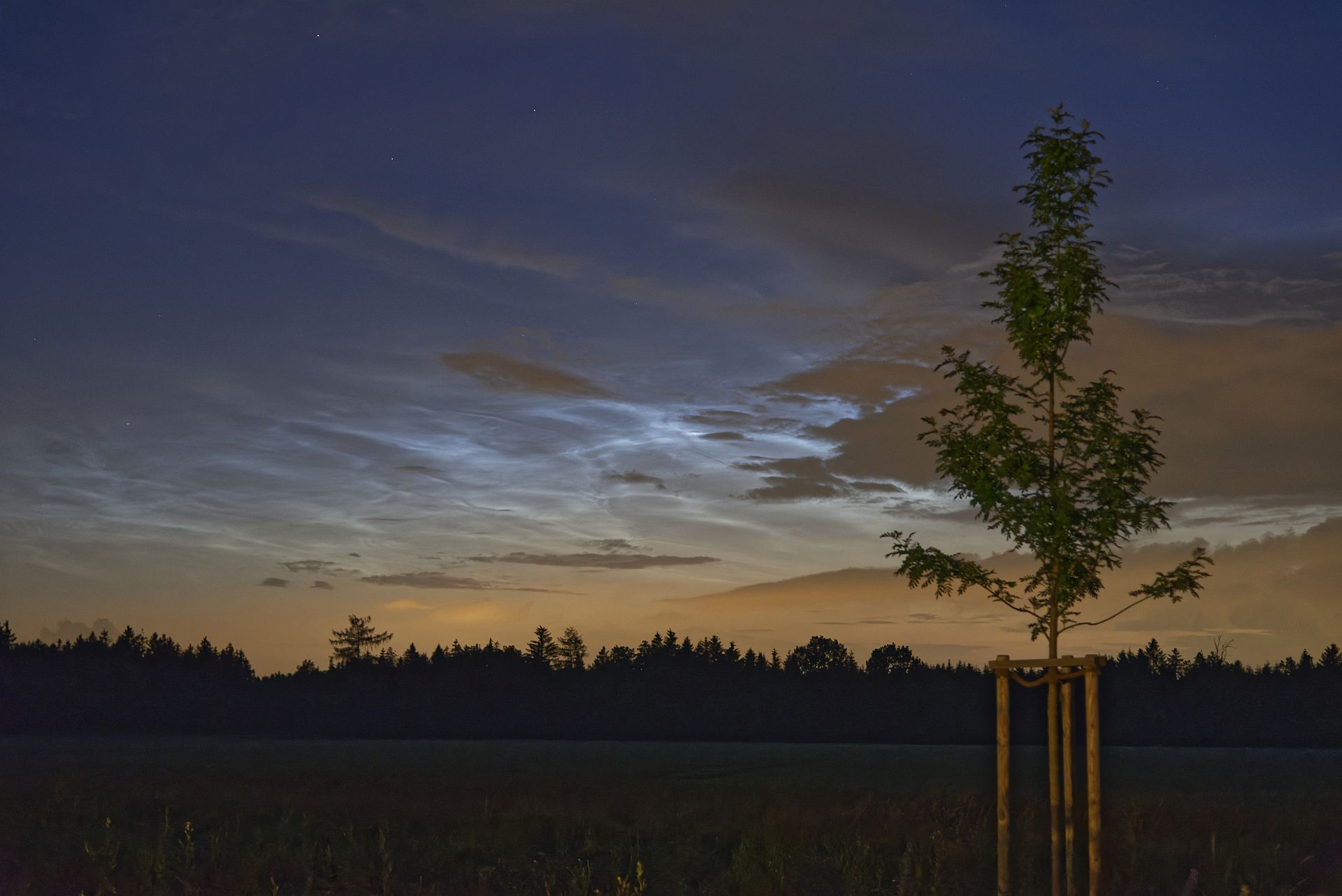 Als ich gegen 22:15 (MESZ) vom Sport zurückkam, fiel mir ein Wolkenfeld im Norden auf, das eigentlich zu hell für Cirren war, aber nach Cirren aussah und nicht nach NLC. Zumal weiter südlich noch eine Kondensstreifen-Cirre zu sehen war. Etwas später wurde klar, dass es tatsächlich NLCs sind. Es ist das erste Mal in diesem Jahr, dass ich sie hier von Heidelberg aus sehen konnte (meine dritte Erscheinung insgesamt).