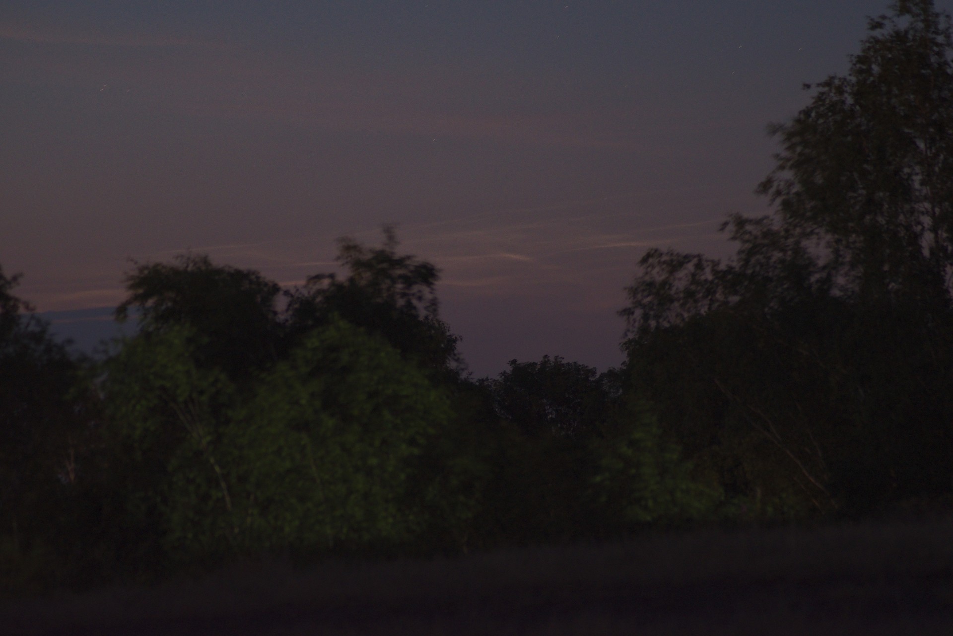 Auch auf meinen Bildern wird deutlich, dass in der Nacht vom 28. auf den 29. Juni NLCs im nördlichen Deutschland und daran angrenzenden Gebiet wirklich nur in ganz, ganz spärlichen Dosen zu verzeichnen waren. (Insofern kann ich das hier im Facebook-Post gezeigte Bild nicht so ganz nachvollziehen ... ok, um 2:00 war hier der Himmel dicht.) Visuell waren nur das Abendrot und die wolkigen Tiefflieger wahrnehmbar, erst auf dem Chip (Nikon D 7200, Sigma 18-300 bei ca. 31 mm f/4 und ISO 500 / 5s) sind NLC - Strukturen zu erahnen.