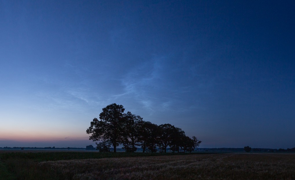 Auf ging es in Richtung Norden, nicht weit, aber zumindest an den Rand der Diepholzer Moorniederung, wo am Beobachtungspunkt ein paar schöne alte Eichen auf mich warteten. Kurz bevor ich ankam, gab es bereits ohne Ende NLC-Meldungen, zusammengefasst: “Relativ hoch, visuell deutlich zu erkennen und in nordöstlicher Richtung”. Kaum verließ ich die von Bäumen gesäumte Zufahrtsstraße, sah ich sie auch schon in vager Ausprägung (nahezu Helligkeit 1, rund um 22:40 MESZ, Sonnenstand bei -6,2°) am nordöstlichen Himmel stehen.