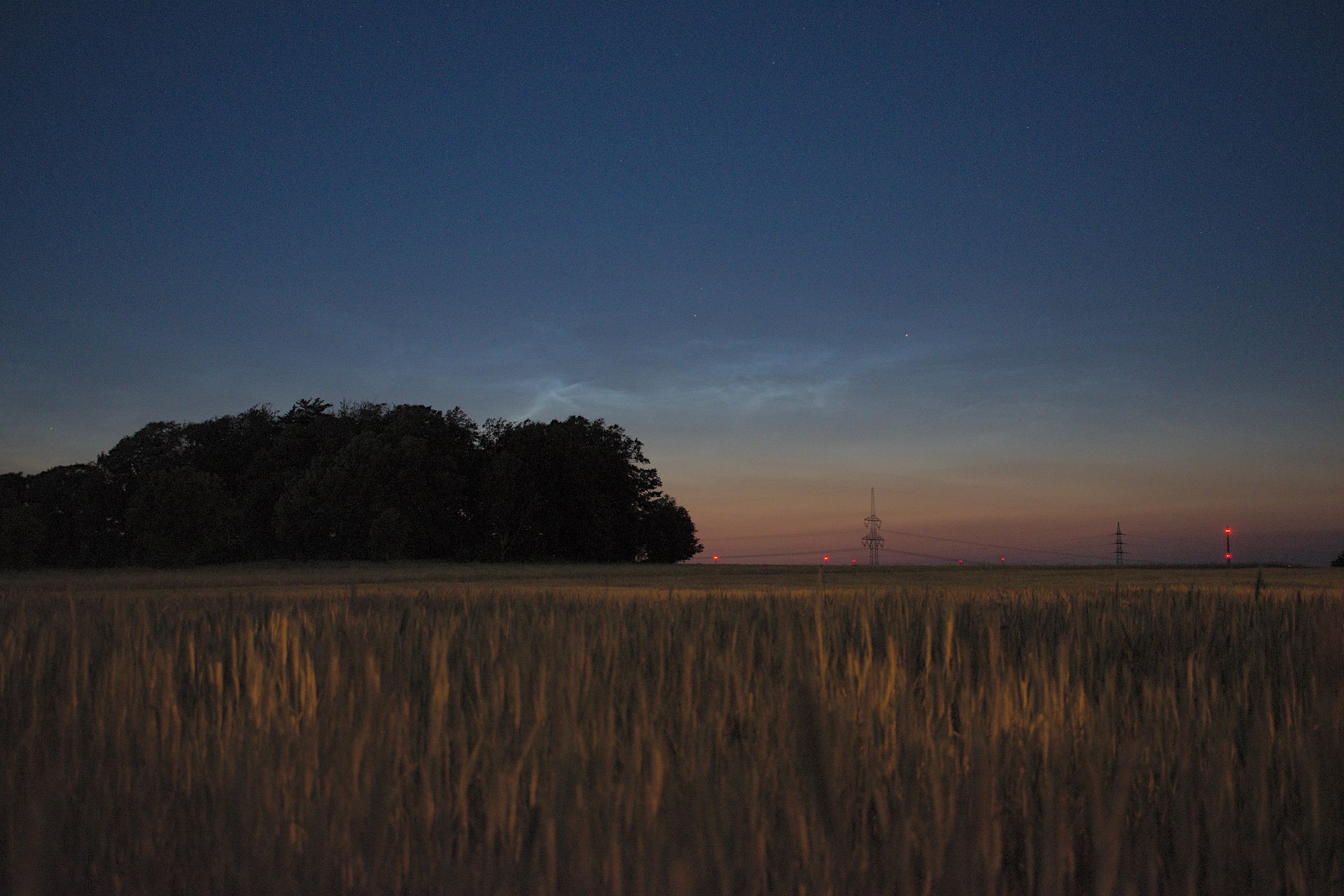 wir haben uns am Abend des 18.06.21 kurz nach 22 Uhr zu einem bereits bewährten Beobachtungspunkt beim nahe gelegenen Oberurseler Stadtteil Oberstedten begeben. Zu diesem Zeitpunkt hatte sich über dem Pfälzer Wald ein ausgedehnter Gewitterkomplex entwickelt, welcher sich via Oberrheinebene auf den Weg in den Frankfurter Raum begab. Unser Zeitfenster zur Beobachtung würde also beschränkt sein. Tatsächlich wurde bereits nach kurzer Zeit ein mächtiger Zirrenschirm sichtbar, welcher sich von Südwesten heranschob. Gegen 22:40 waren Richtung WNW neben dem Zirrenbereich vage Strukturen mehr erahnbar als sichtbar, welche wir als NLCs einstuften, was sich später an Hand eines Fotos bestätigte (Abb. 1).