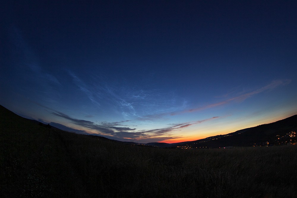 wir haben die NLC gegen 20.00 Uhr auf unserer Terrasse in Schwarzenberg entdeckt, zum einen ziemlich hoch im Westen und ein zweites Feld im Süden, wo wir uns aber anfangs nicht sicher waren, ob es nicht doch Cirrus ist. Da wir kein Nordblick haben, sind wir wie die Verrückten schnell ins Auto und zu unseren Beobachtungsplatz hoch gefahren. Was uns da erwartete, war der Hammer. Ein herrliches Feld im Nordwesten und im Süden reichten die Strukturen bis etwa 45° über den Horizont (etwa deshalb, weil wir ihn von da aus nicht sehen). Ziemlich schnell zog sich dann das Geschehen in den Nordwesten zurück, wo das Feld dann verblasste und aufziehende Wolken das Spektakel schließlich beendeten.