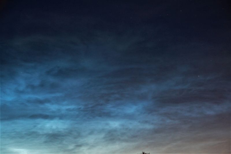 Aus Wetzlar sind die NLCs anhand ihrer deutlichen Helligkeit auszumachen, trotz im Norden fast geschlossener Wolkendecke. Ca. 25° hoch im Norden, Westen von meinem Standpunkt nicht sichtbar., Strukturen nur auf Fotos erkennbar. Die dunklen Wolken täuschen sicher, aber ich glaube so helle NLCs habe ich in der Höhe noch nie gesehen.