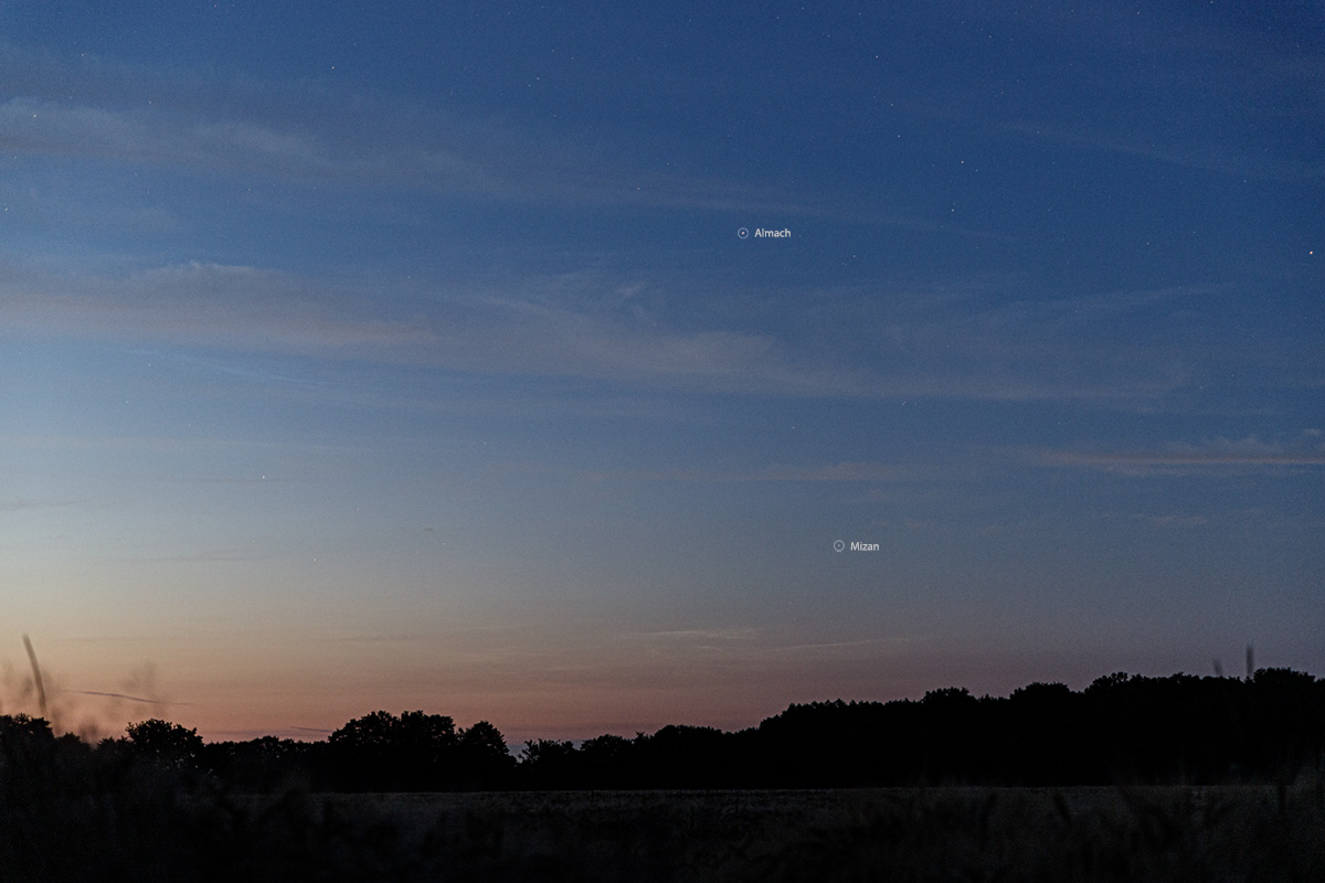 Trotzdem habe ich meine Kamera Richtung Norden gehalten und konnte dort auf 32° rechts unter Mizam - eventuell - ein kleines NLC-Feld ausmachen. Nur fotografisch, visuell ging da gar nix.